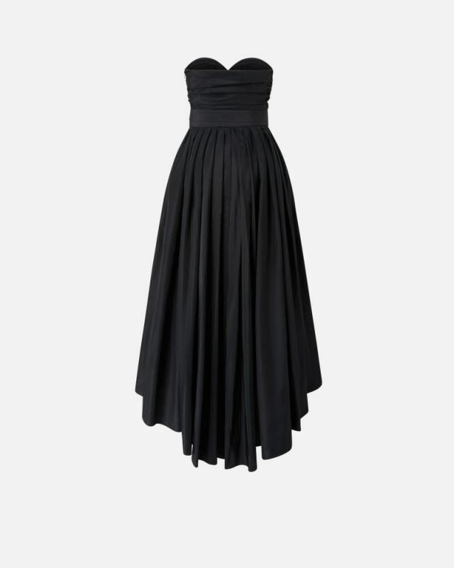 Vestito midi senza maniche realizzato in taffetà, tessuto che si presta particolarmente bene alla costruzione di volumi geometrici ed effetti speciali. L’abito elegante è caratterizzato da bustino senza spalline con scollo a cuore incrociato e gonna voluminosa a pieghe morbide, leggermente più corta davanti per incorniciare le scarpe raffinate che deciderai di abbinare. Dettagli particolari dell’abito sono la cintura a fusciacca da annodare alta sul bustino per enfatizzare la silhouette e aggiungere un tocco speciale, e le tasche inserite sui fianchi. Grazie al suo design caratteristico e al tessuto nel quale è realizzato, questo abito diventerà il protagonista delle tue cerimonie di stagione.