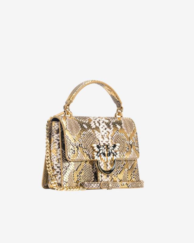 Mini Love Bag One Top Handle Light in pelle stampa rettile dal particolare effetto spalmato e laminato bimateriale. La chiusura è completata dall’iconica fibbia Love Birds Diamond Cut in metallo galvanica light gold con smalto nero, impreziosita con pavè di pietre bianche opalescenti. L’interno è foderato a contrasto di colore e comprende tasca a parete con zip. Manico singolo top handle e tracolla rimovibile a catena metallica con spallaccio regolabile in pelle. La borsa fa parte della speciale capsule collection Limited Edition realizzata in tiratura limitata esclusivamente per PINKO Galleria. Utilizza lo speciale chip NFC per vivere una speciale experience dedicata alla borsa che hai acquistato!