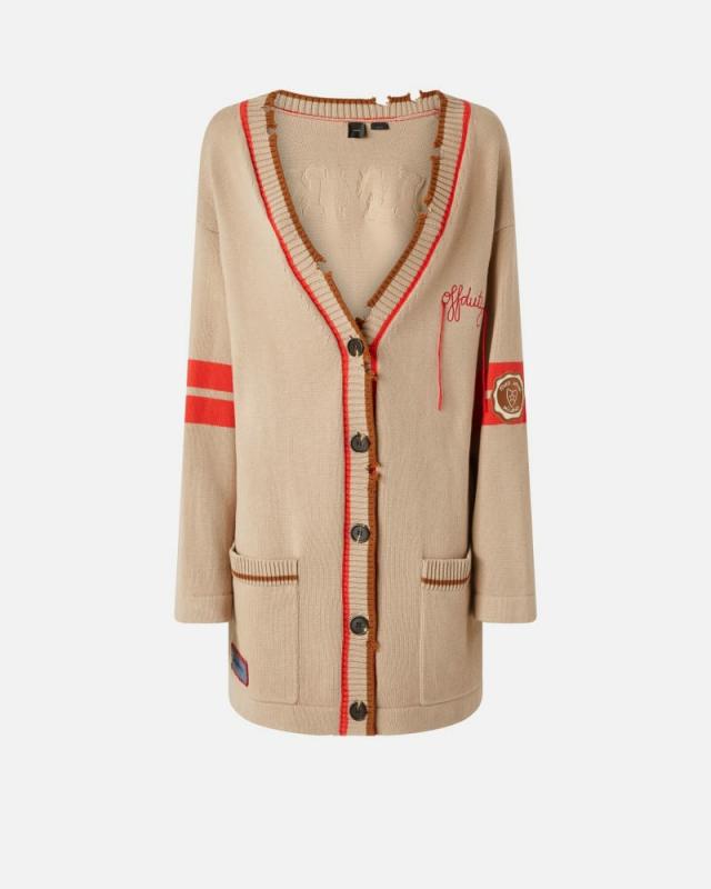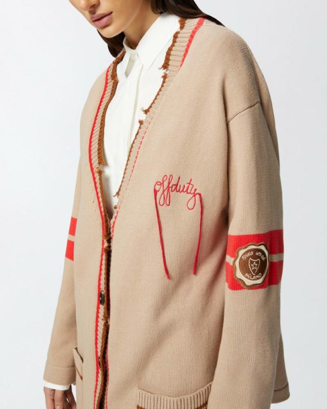 Cardigan oversize stile college realizzato in maglia di misto cotone personalizzato con ricamo “off duty” con filo rosso davanti, lato cuore. La parte posteriore è caratterizzata da maxi lettering PINKO realizzato con tecnica patch che combina una texture morbida e paillettes scintillanti. Le maniche lunghe a giro leggermente basso sono personalizzate con doppia banda rossa a contrasto e un patch logato su una delle due maniche. Il profilo dello scollo a V e dell’apertura, lavorato a costine, è definito da banda color block a contrasto di colore, per richiamare ulteriormente lo stile varsity. Chiusura con bottoni davanti. Questo cardigan diventerà immediatamente il protagonista del tuo outfit, grazie ai ricchi dettagli che lo caratterizzano e che ne definiscono lo stile.
