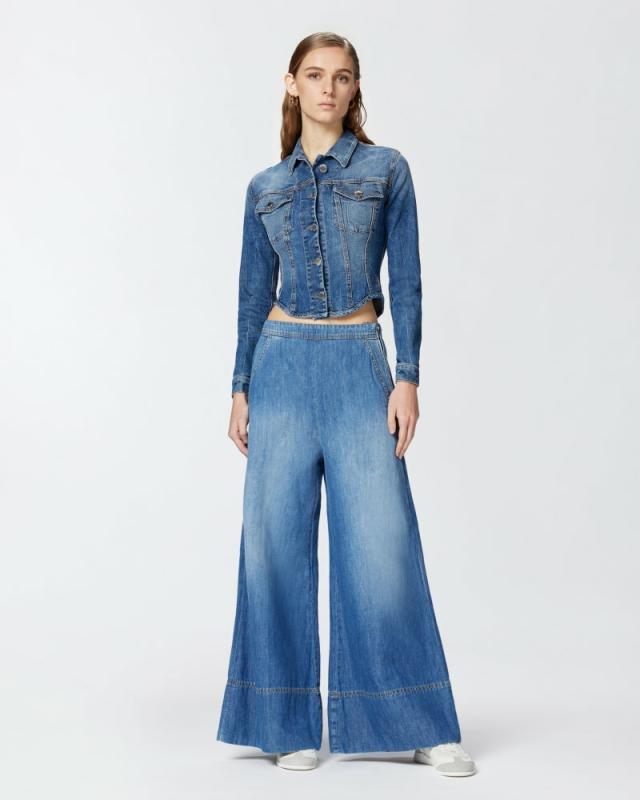Giubbino corto in denim comfort indaco, dal lavaggio medio scuro, caratterizzato da una silhouette aderente che si ispira ai bustini, con impunture verticali e fondo capo con orlo stondato. Il giubbino jeans è completato da colletto a camicia, maniche lunghe e taschini applicati con patta. Chiusura con bottoni a chiodo in metallo davanti. Questo giubbino è il perfetto completamento per un total look denim che si fa notare.