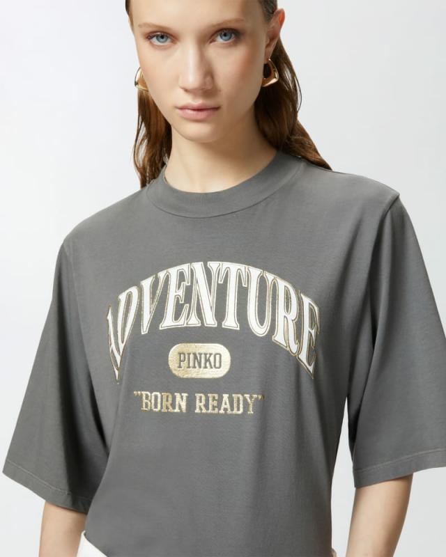 T-shirt dal volume boxy in morbido jersey di cotone personalizzata con stampa stile college a tema PINKO Adventure”, con dettagli glitterati. La maglietta è caratterizzata da mezze maniche dal volume ampio e taglio leggermente più corto per un look and feel contemporaneo. La t-shirt è un capo estremamente versatile, che si abbina alla perfezione come sottogiacca con un blazer maculato e i mocassini per una giornata in ufficio.