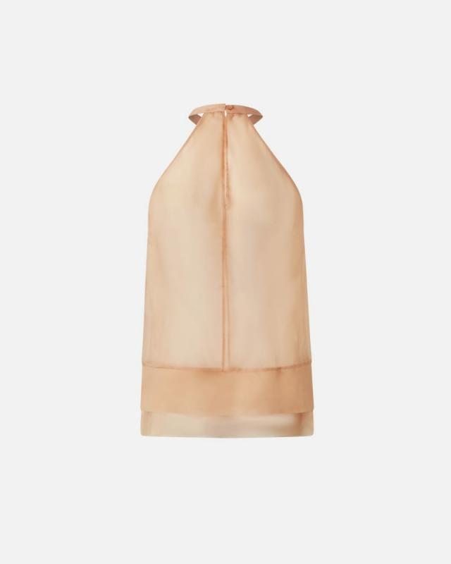 Top da donna senza maniche realizzato in preziosa organza di seta con colletto impreziosito da ricamo di scintillanti castoni gioiello. Lo scollo all’americana è completato da dettaglio a goccia con piccolo bottone nel centro dietro. Il volume morbido e i dettagli preziosi del top ti premettono di completare con agile raffinatezza i tuoi outfit per le occasioni speciali.
