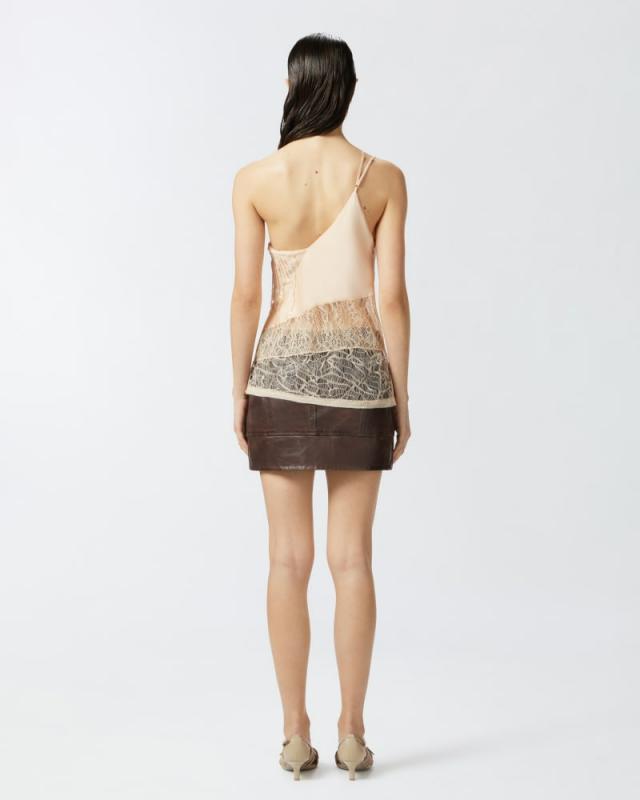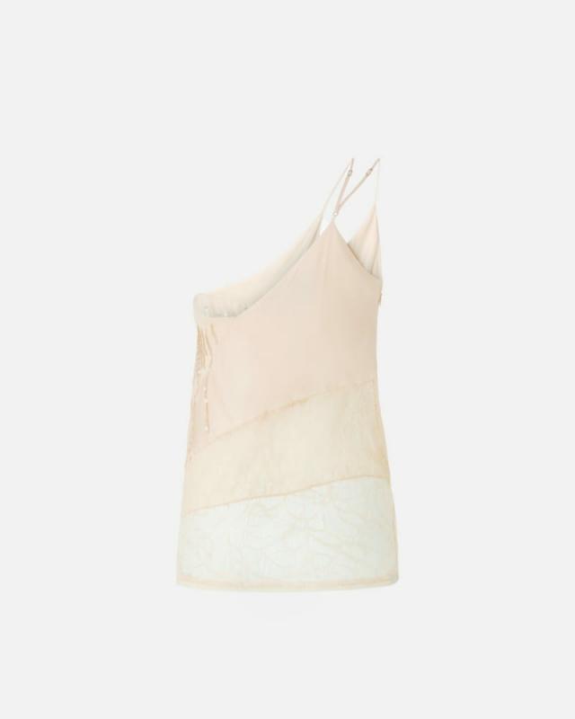 Top senza maniche da donna realizzato in lucido raso con inserti in pizzo e rete ricamata con diversi motivi, a creare un motivo patchwork dall’aspetto raffinato e femminile. La linea smanicata del top è caratterizzata da scollo monospalla con spallina sottile con dettaglio di cut out e ricami di frange di paillettes nella parte superiore davanti. La linea semplice ma elegante di questo top, impreziosita dai dettagli, lo rende un perfetto sottogiacca da indossare con un tailleur nelle occasioni speciali e cerimonie di stagione.